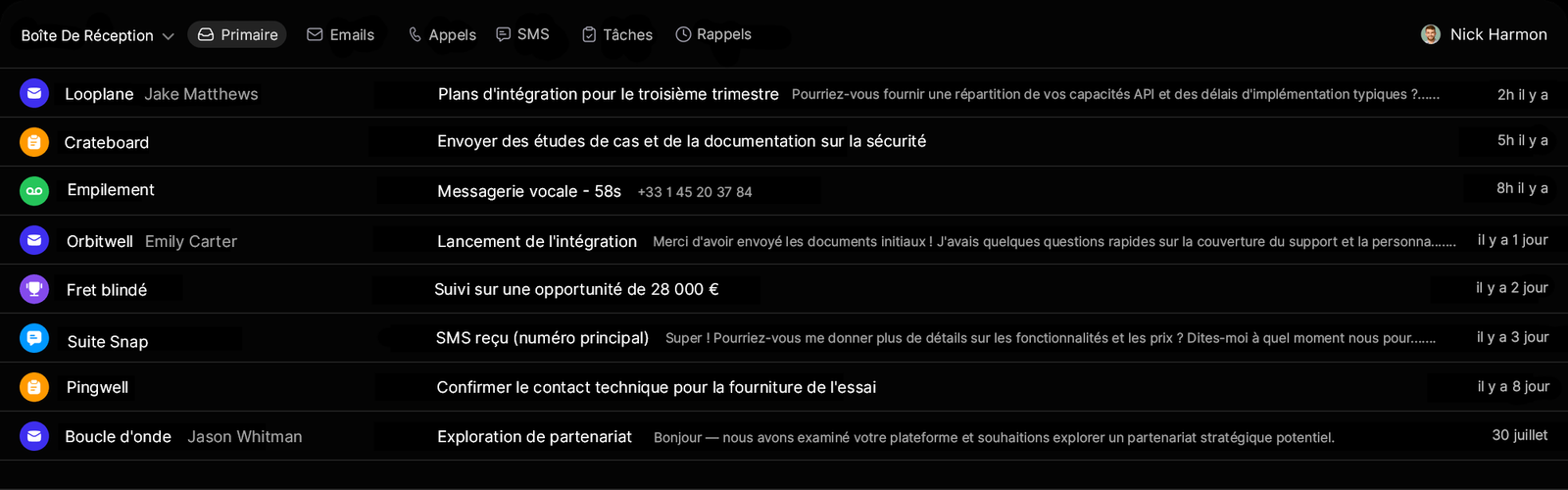 Les e-mails, appels et SMS sont enregistrés automatiquement dans un CRM simple et fluide, votre équipe garde toujours le bon contexte.