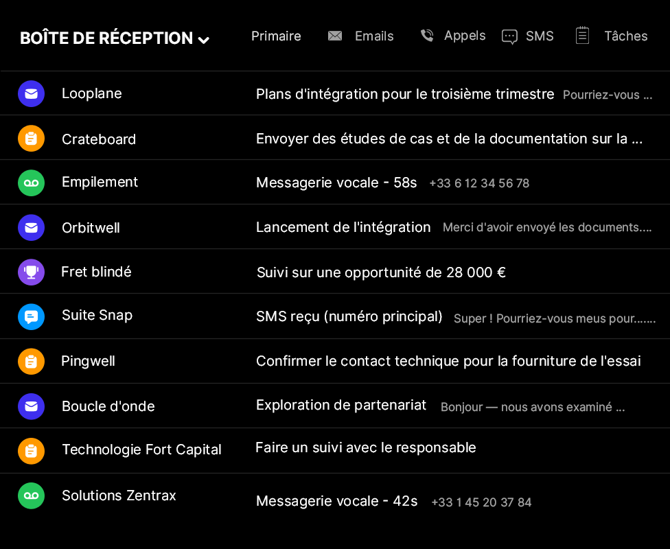 Appels, messages, e-mails et deals réunis en un seul endroit. Plus de confusion.