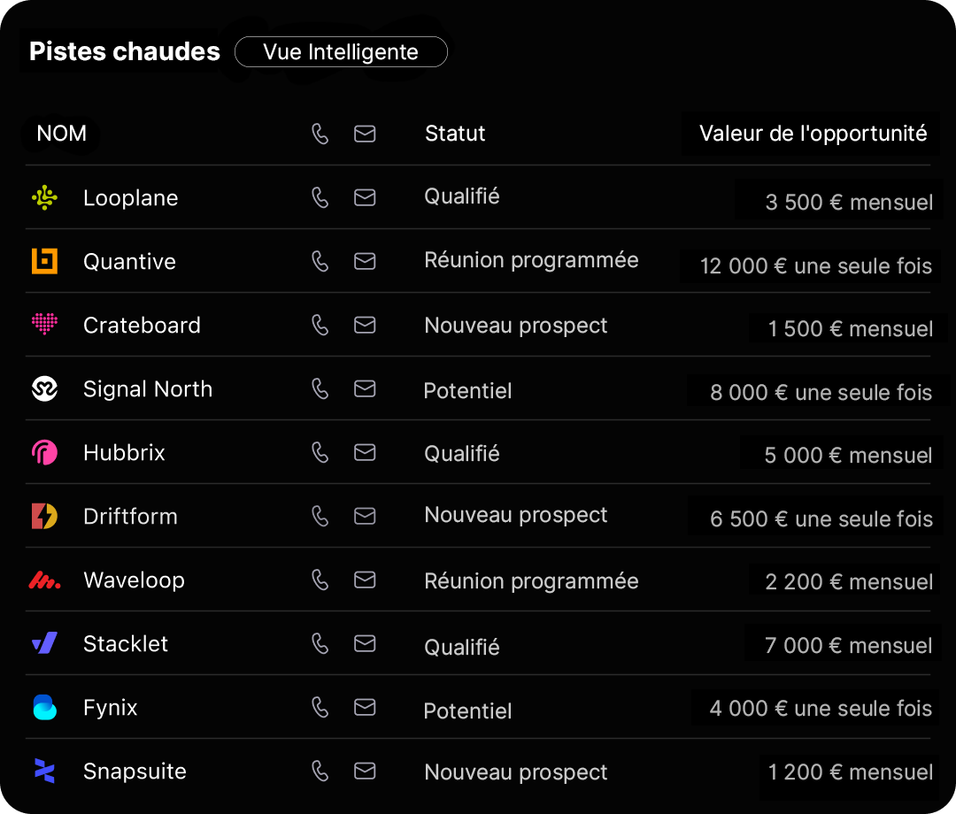 Gax priorise relances, messages manqués et tâches en retard, avec des vues intelligentes pour suivre leads et deals clés.