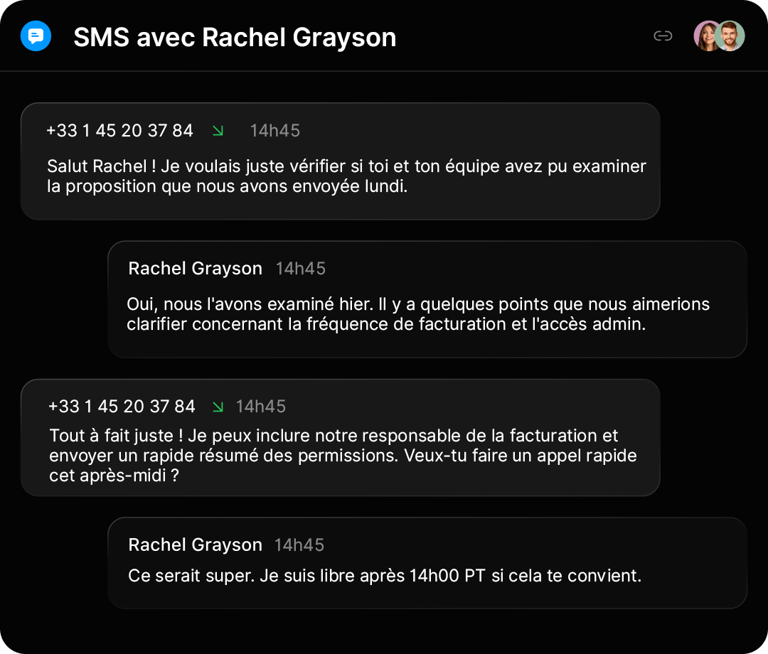 Envoyez et recevez des SMS directement dans Gax. Ajoutez des étapes SMS automatisées à vos workflows pour contacter vos leads plus vite.