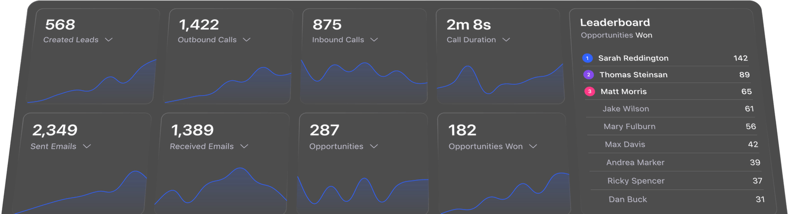 Créez des tableaux de bord pour différentes équipes, rôles ou objectifs. Combinez les données d’activité, de pipeline et de revenus dans une vue unique, adaptée à ce qui compte pour vous.